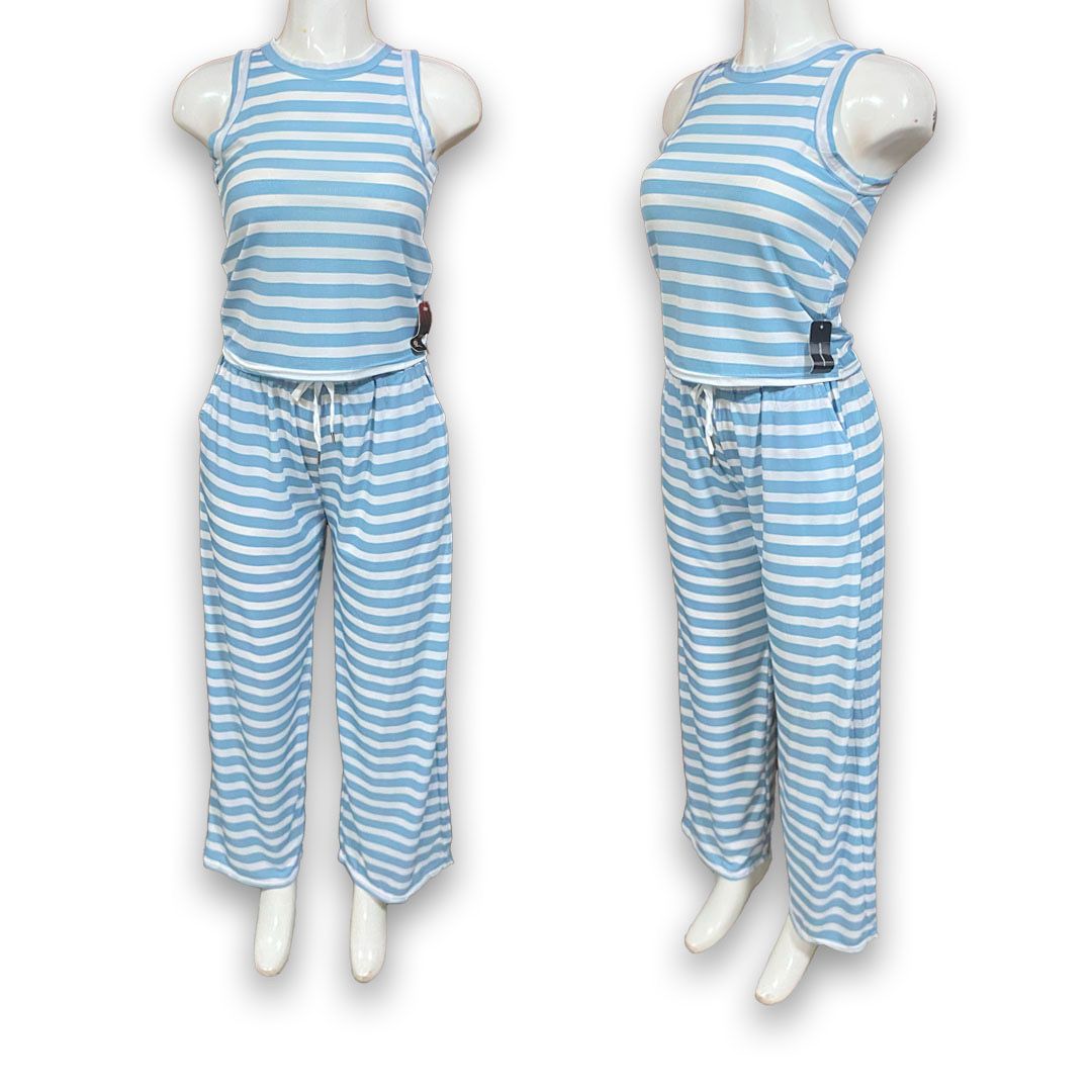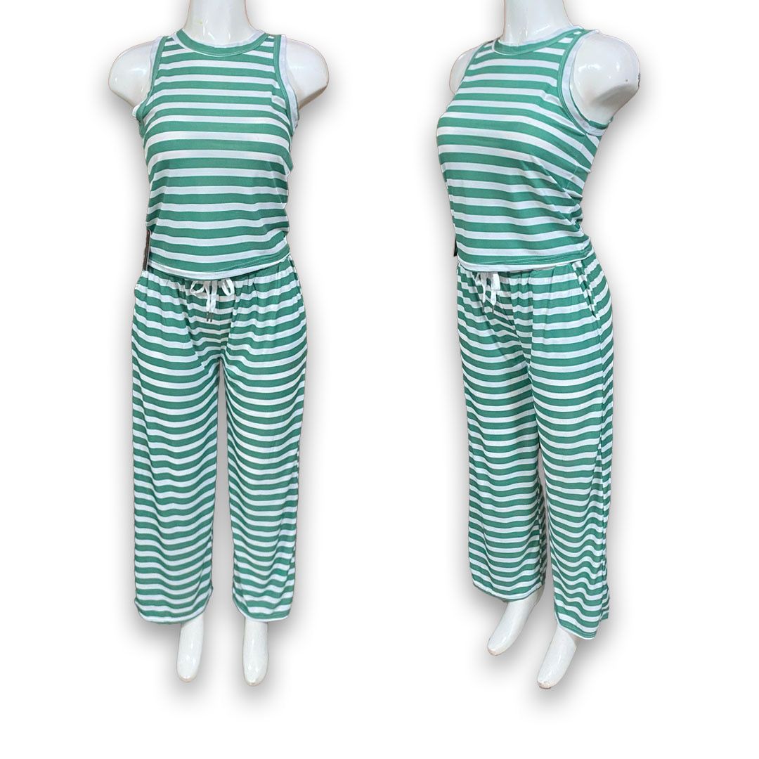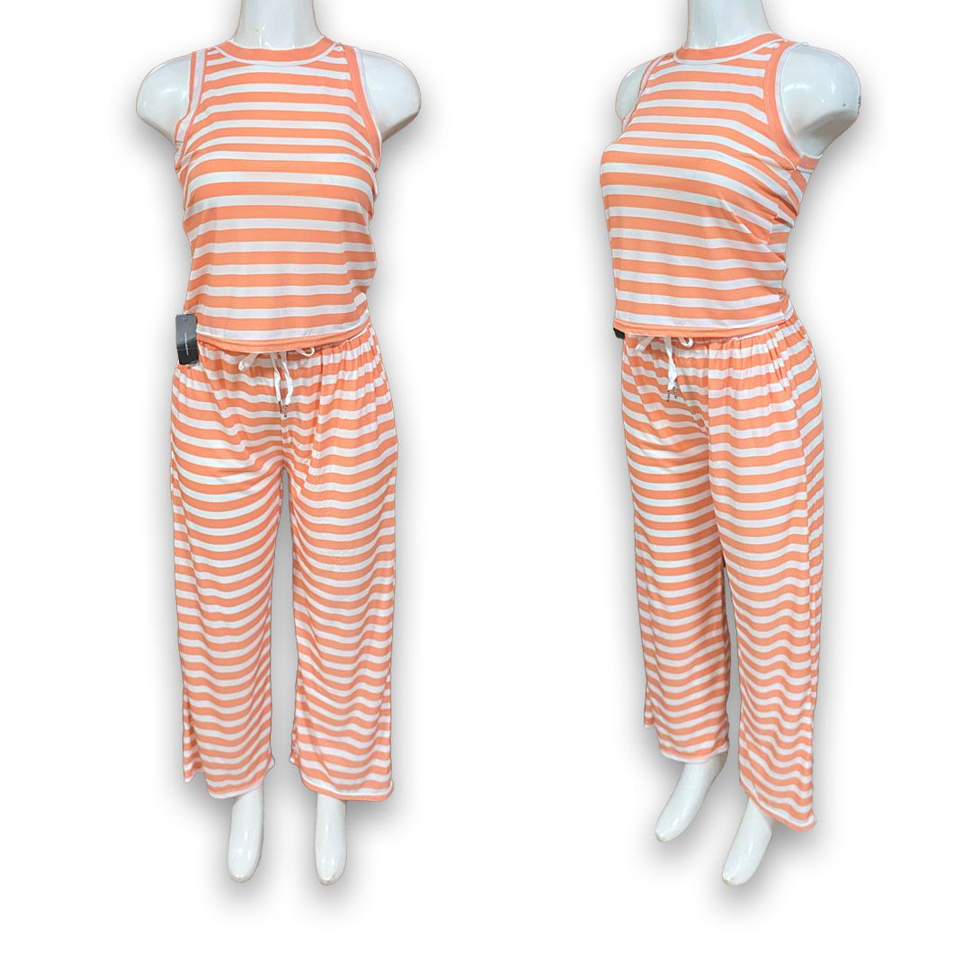 Este paquete incluye 10 conjuntos de dama con blusa sin mangas y pantalón con amarre en la cintura. Con estampado de rayas y diseño versátil, son ideales para el día a día y fáciles de mover en tu inventario.