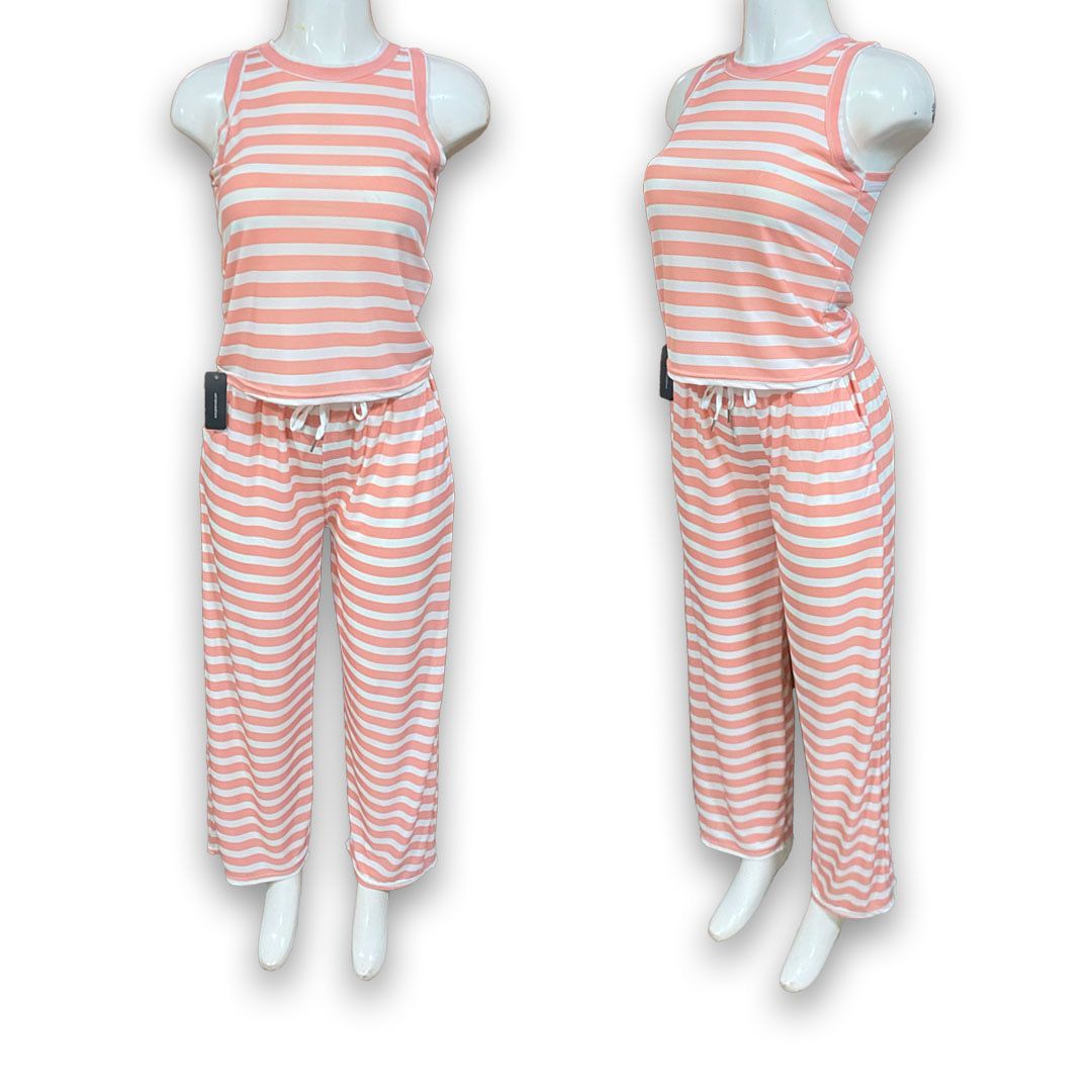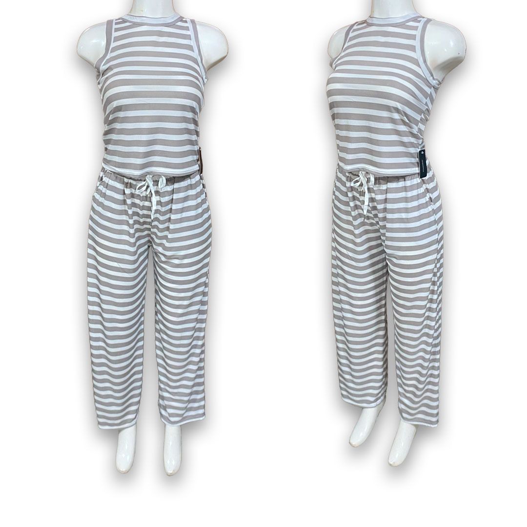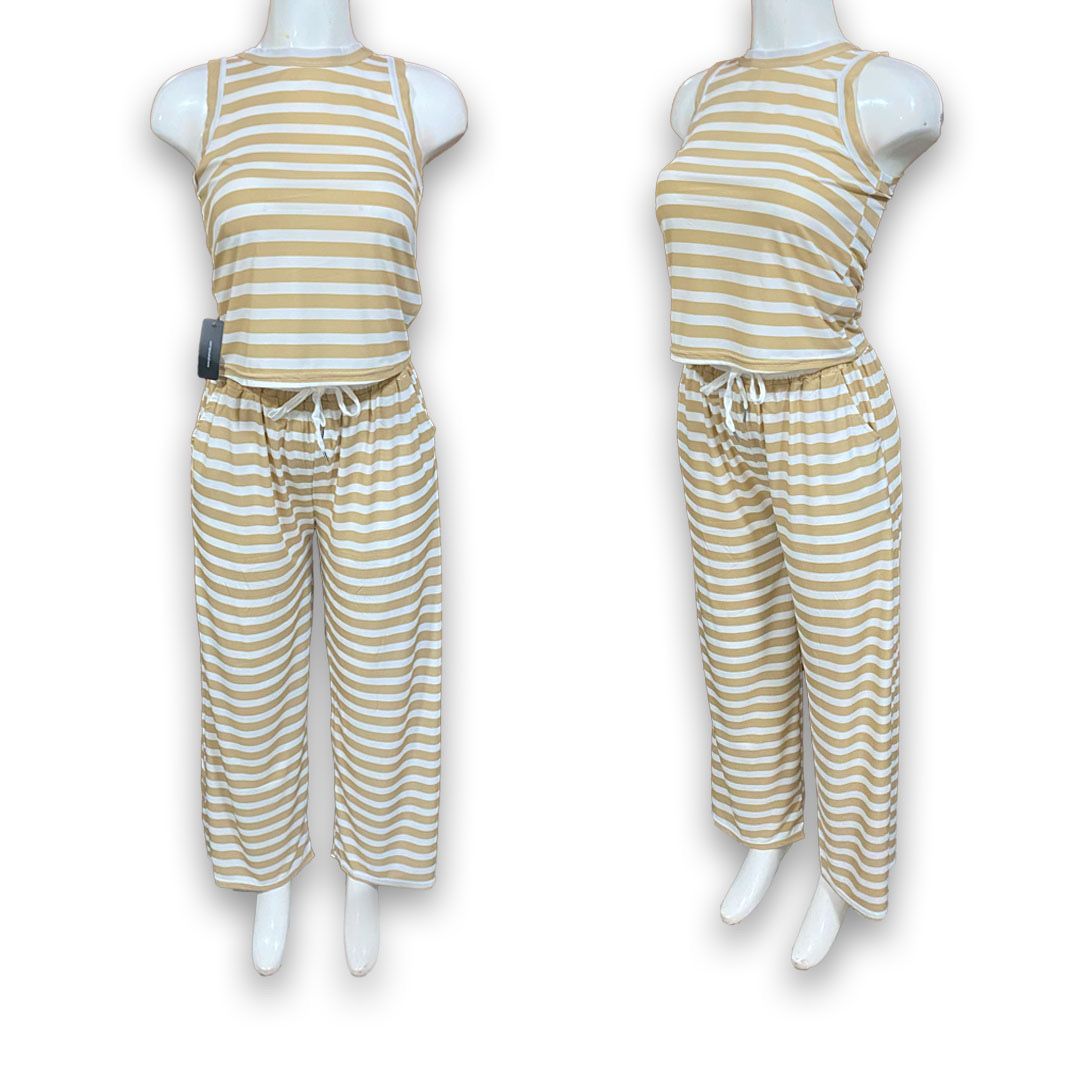 Este paquete incluye 10 conjuntos de dama con blusa sin mangas y pantalón con amarre en la cintura. Con estampado de rayas y diseño versátil, son ideales para el día a día y fáciles de mover en tu inventario.